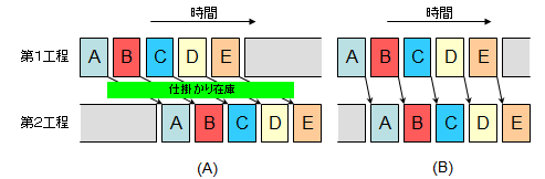 問題の本質を見誤ると、かえって傷口を広げてしまうことがあります。かつては稼働率を上げることが目的化し、そのために当面必要ないものまで作ってためてしまう工場も存在しました(いまも?)。これはナンセンスですね。もちろん「結果的な」フル稼働は歓迎ですが、忙しく稼働しているからといって「うまく製造している」ことにはなりません。図1の(A)(B)はともにフル稼働状態ですが、(B)が滞りなく流れているのに対し、(A)の方は工程間の待ち時間が常に発生して製造リードタイムを無駄に引き延ばしており、仕掛かり在庫がたまった「下手な製造」といえるでしょう。フル稼働は「上手な製造」の十分条件ではないのです。