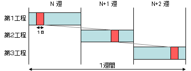 材料から製品を作るまでに3週間かかってしまいます。正味作業時間は1日×3工程で3日しかないのですから、21日間のうち18日間は無為に待っているわけです。