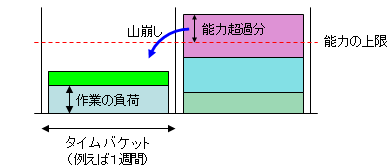 「いやいや、うちのMRPはそんなことはない」といわれる方も多いでしょう。当然この問題を解決するための方策も試みられており、その1つが「負荷」という概念の導入です。1週間や1日などといったMRP処理の単位期間の枠(タイムバケット)の中に作業を山積みします。そしてこれが一定の負荷水準(能力の上限)を超えると、1つ前の期間(タイムバケット)にずらします。一度積み上げてから崩すので「山崩し」と呼びます。