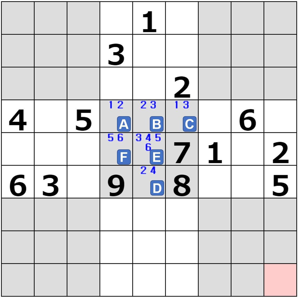 さて、お題です。右の図の中央エリアのマスA~Fの中、確定出来るマスはどちらでしょうか?