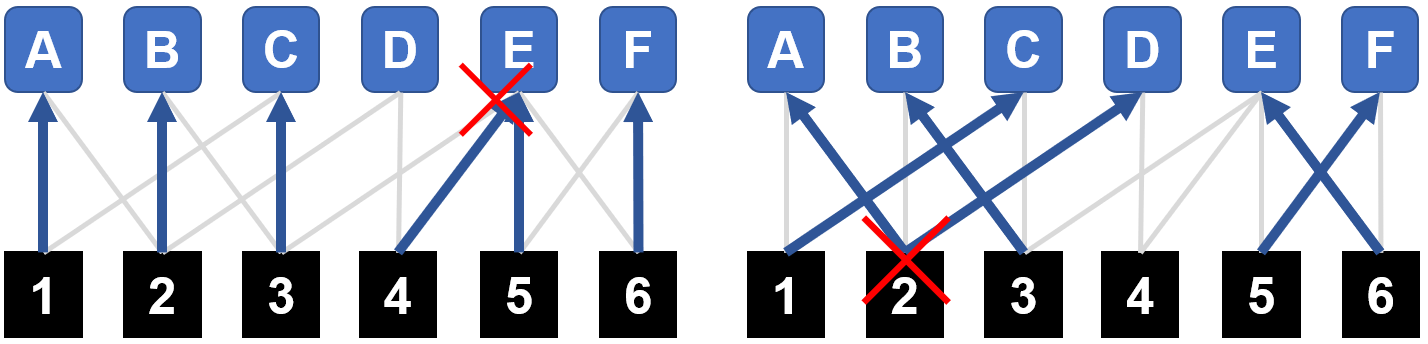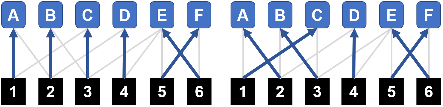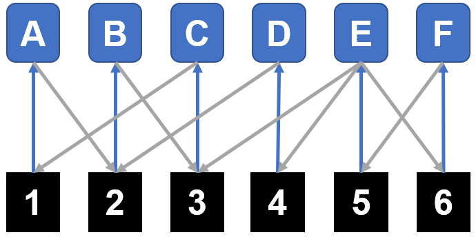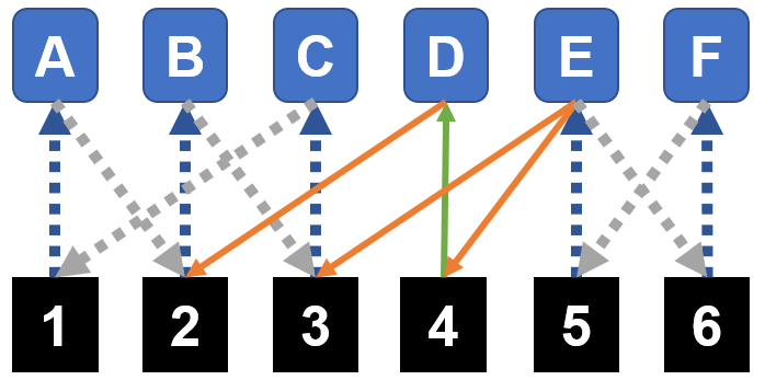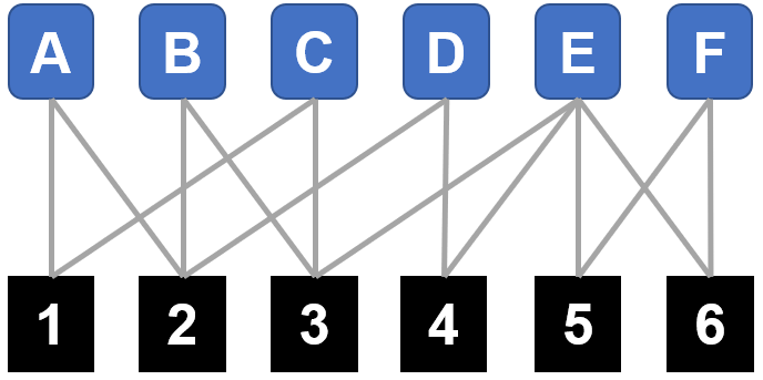 上の行に未知のマスA~Fを置き、下の行に数字1~6を置きましょう。今まで各マスに対し絞り込んだ結果を灰色の接続線で表します。例えば、マスEの候補は3456なので、上の行のEから下の行の3456にそれぞれ線一本を張ります。