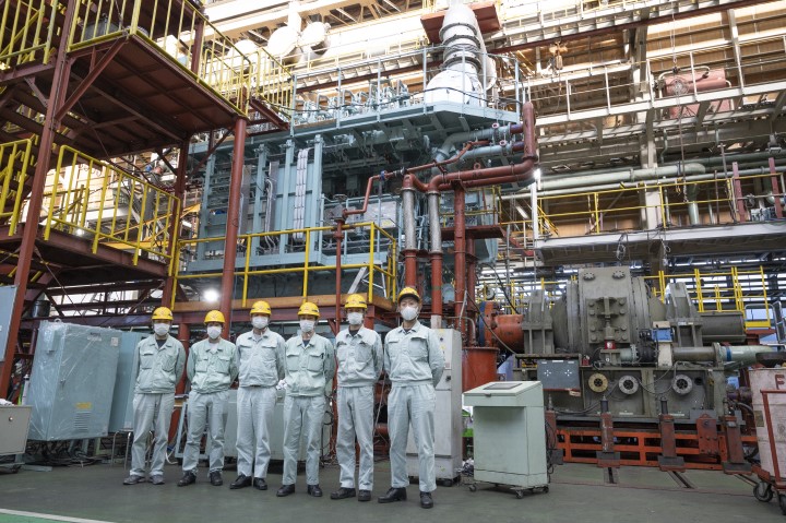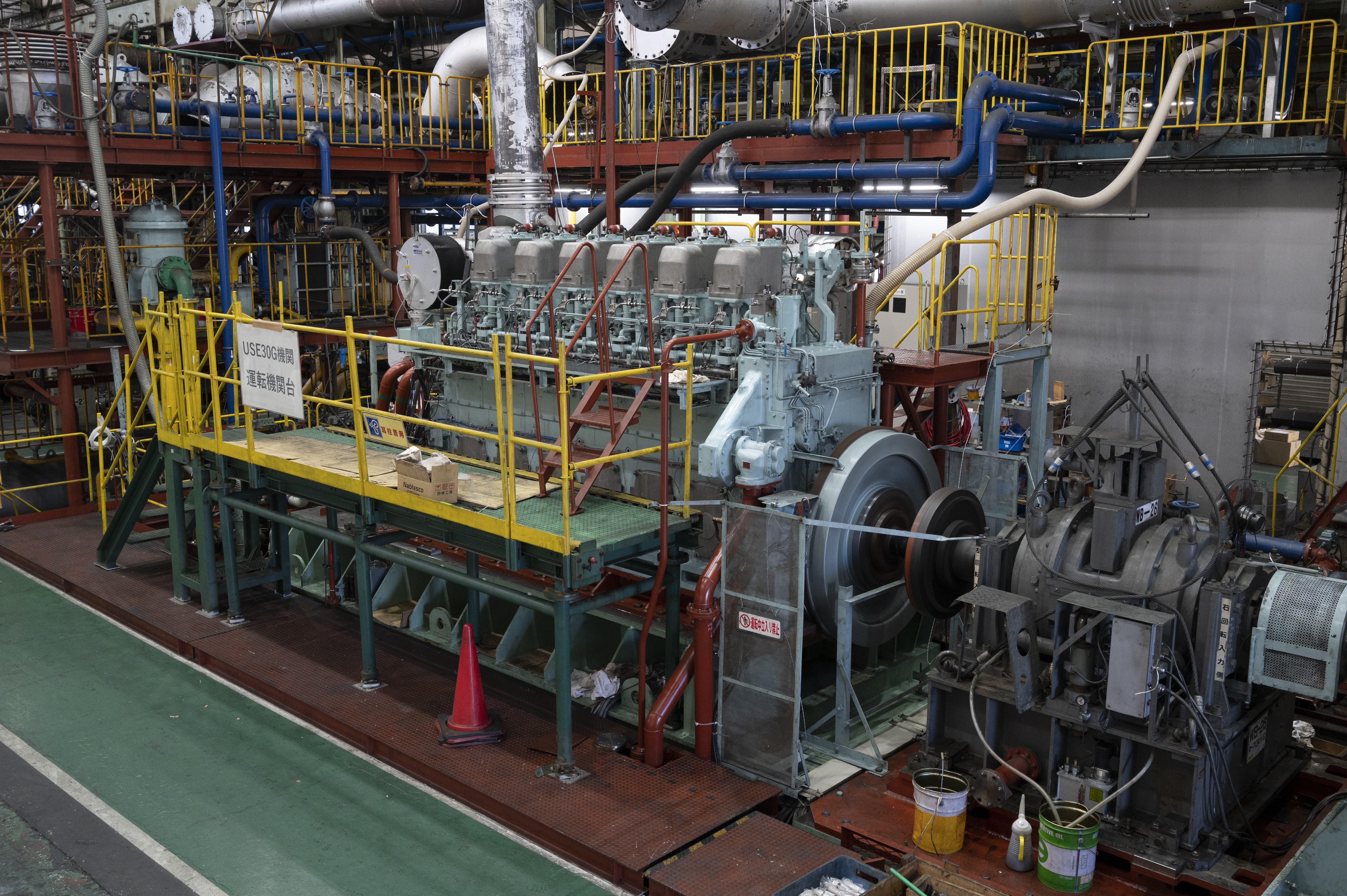 大型船舶用エンジン 型式:6UEC35LSE-Eco-B2の前で撮影