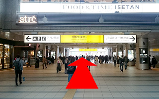 2港南口方面への通路を進むとアトレ/伊勢丹が見えます。東海道新幹線の改札口はこのあたりです。さらに進んでください。