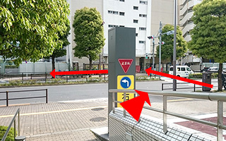 11スロープを抜けたら、すぐ右手の横断歩道を渡ってから、左へ曲がってください。