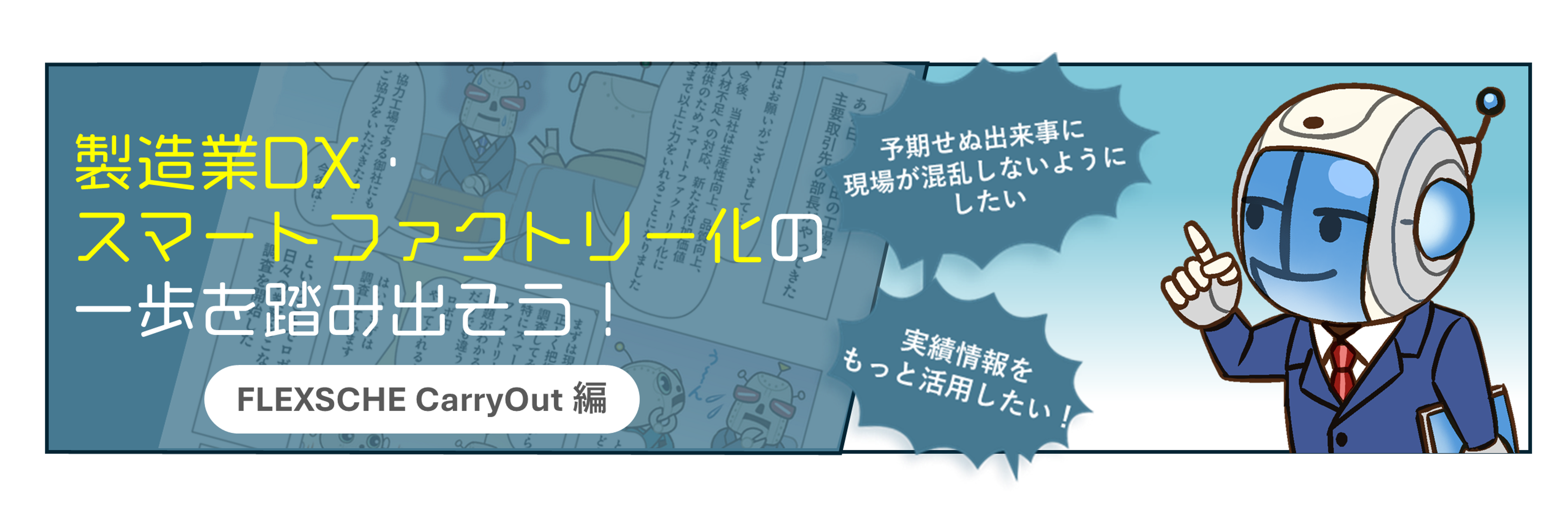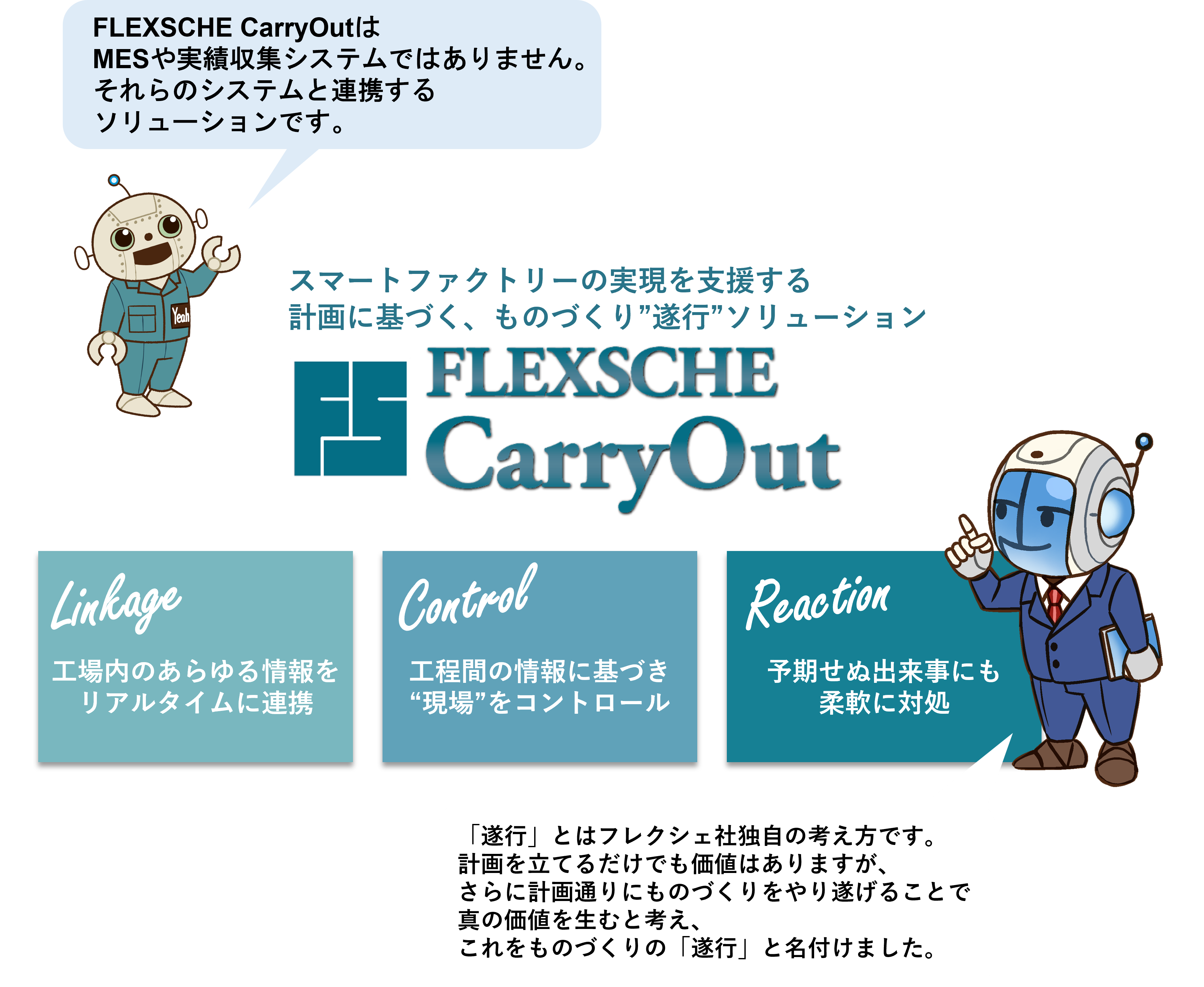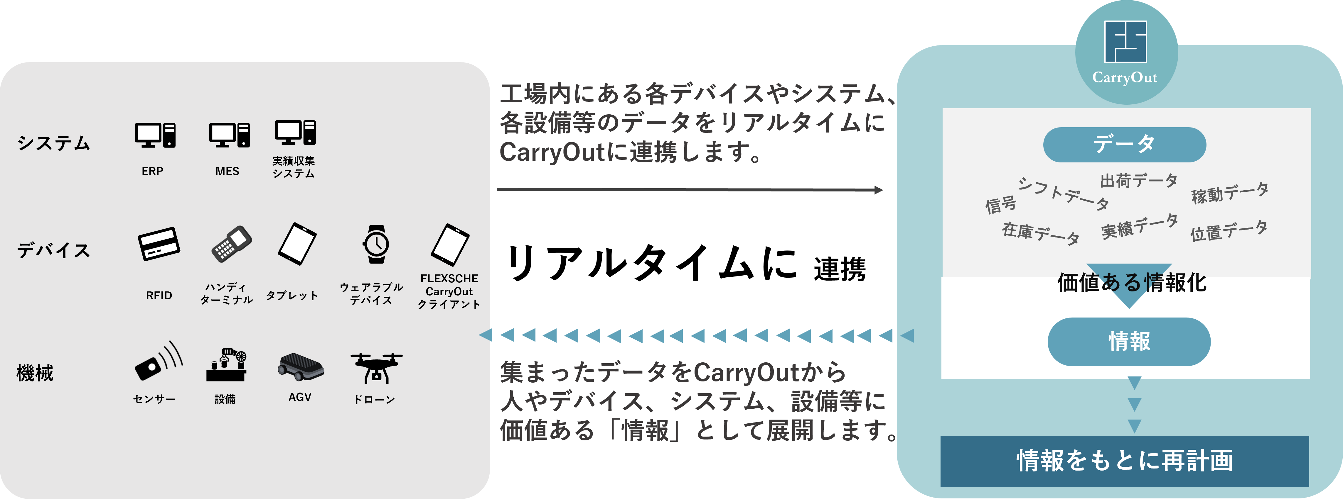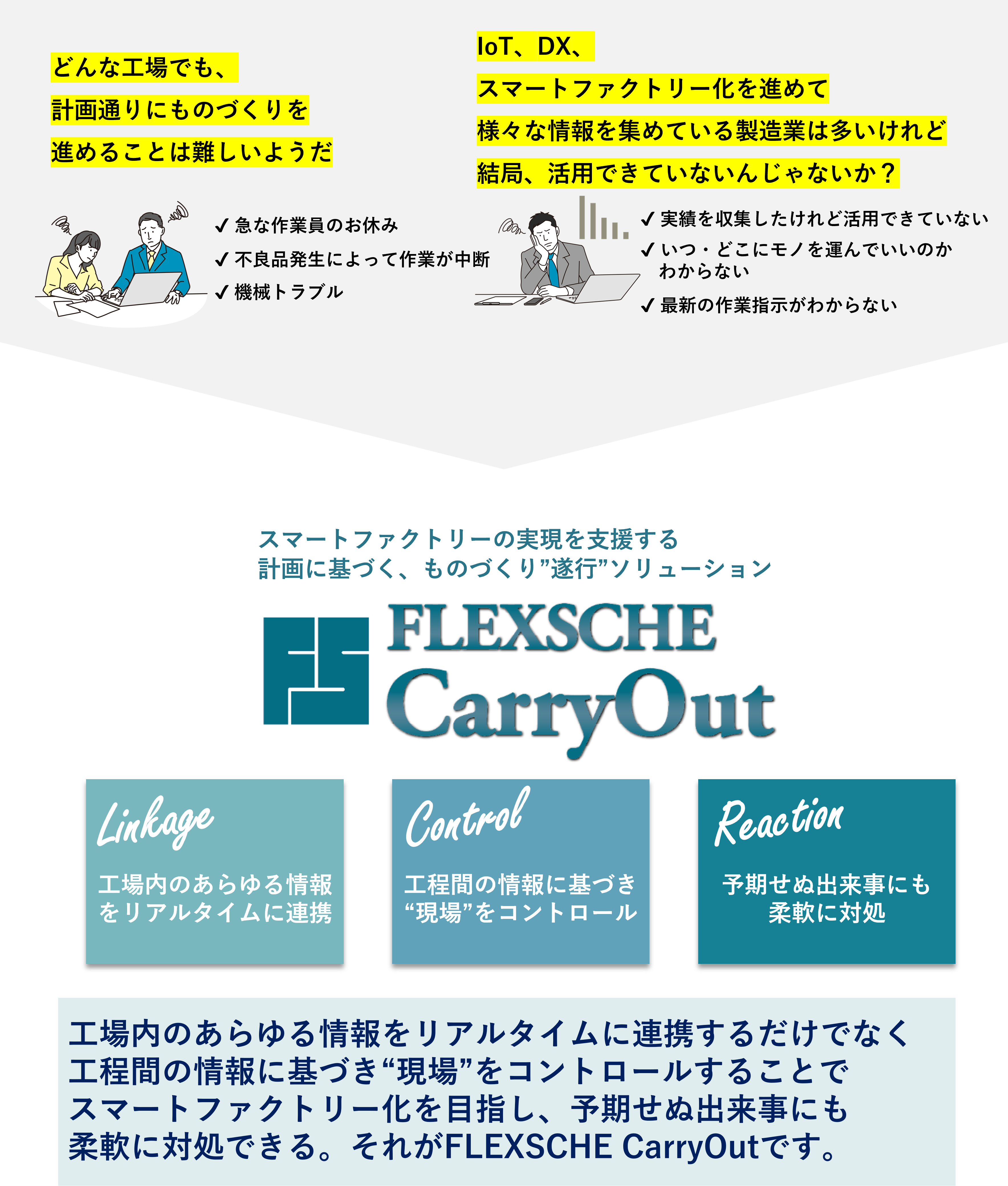 工場内のあらゆる情報をリアルタイムに連携するだけでなく 工程間の情報に基づき“現場”をコントロールすることで スマートファクトリー化を目指し、予期せぬ出来事にも 柔軟に対処できる。それがFLEXSCHE CarryOutです。
