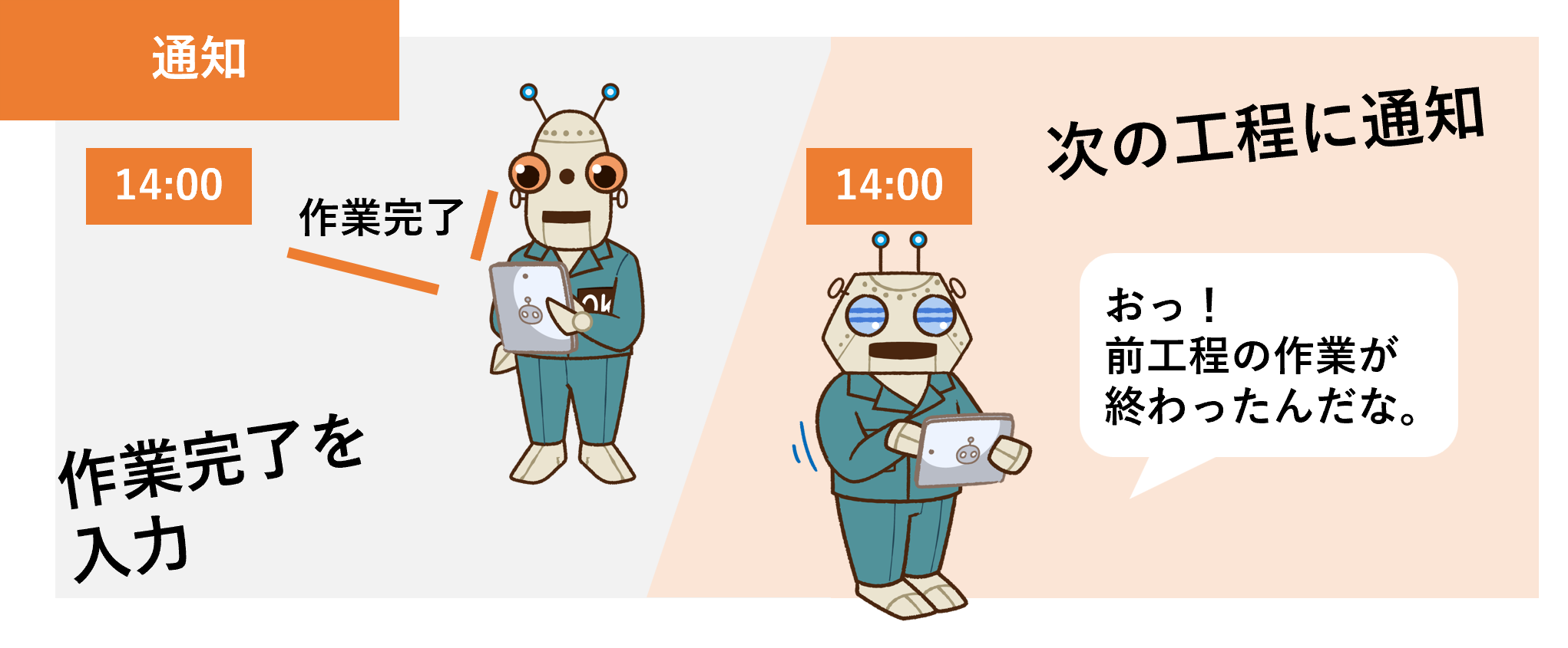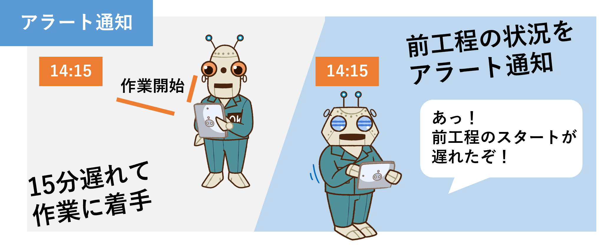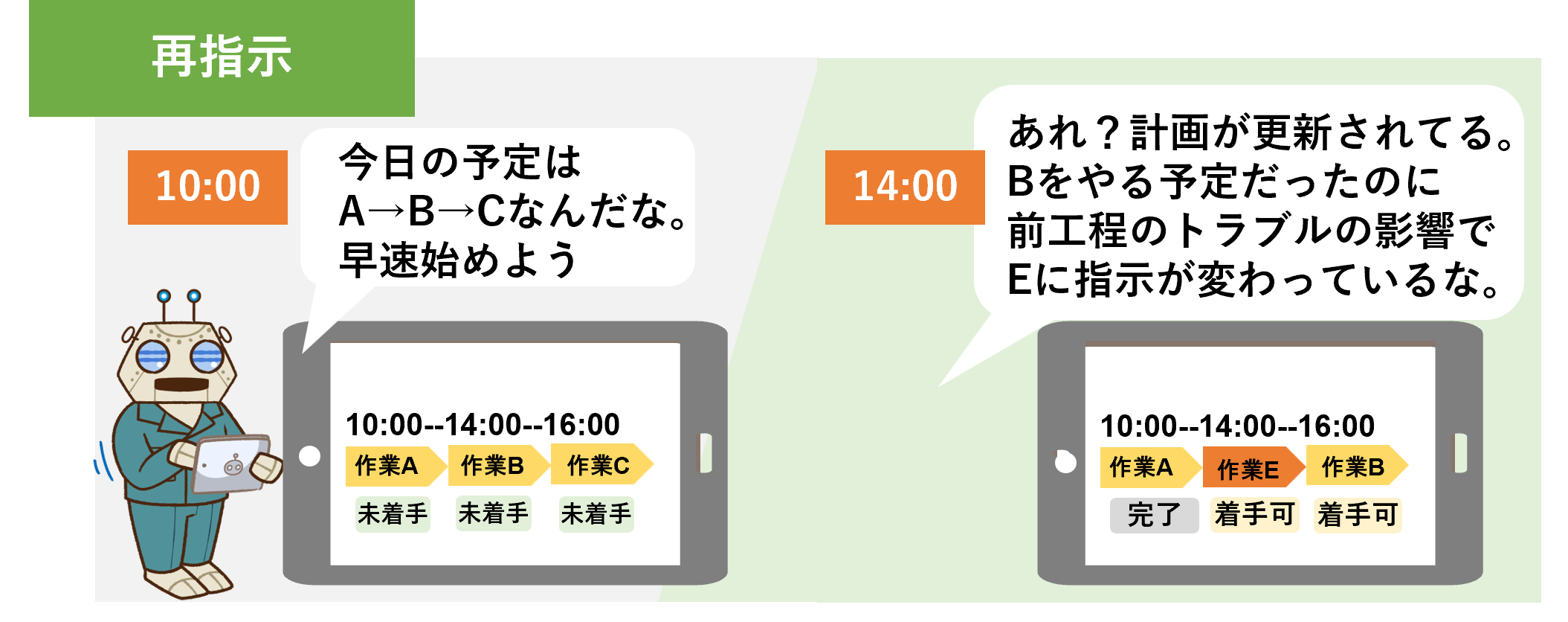 現在進行中であっても最新情報に基づいて現場に通知、アラート、意思伝達、指示、再指示をします