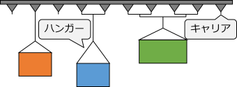 周回するコンベア上にキャリアがついていて、そこにハンガーをぶら下げます。このハンガーに製品を吊り下げて、コンベアの途中にある塗装ブースを通るときに製品を塗装します。オーダーごとに塗装色と使用可能なハンガーが決まっています。
