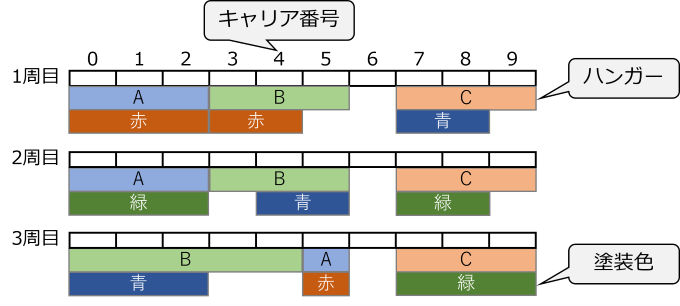 また塗装ブースで塗装する色が切り替わる際には段取が発生し、その間に通過するフックへ製品を配置してはいけません。 例えば2周目のキャリア6番は青から緑への塗装色切替をするために空いています。