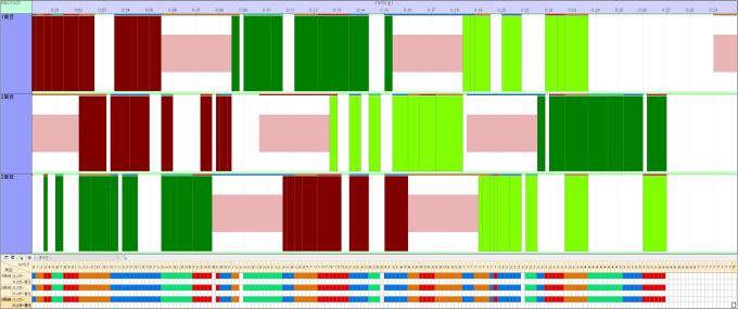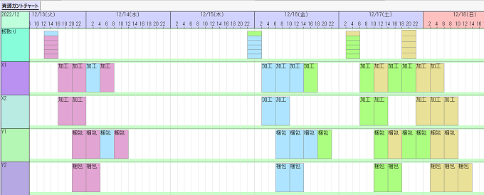 この機能を使用して立案した結果が画像になります。上のガントチャートでは、作業の色が塗装色を、作業上のバーの色がハンガーの種類を表しています。また、異なる塗装色の作業間にはピンク色の段取を挟んでいます。 この計画をハンガーに着目して見やすくしたのが下のデータキューブビューワーで、確かに各キャリアのハンガーが周回間で同じ色にそろってハンガー着脱不要の計画となっています。