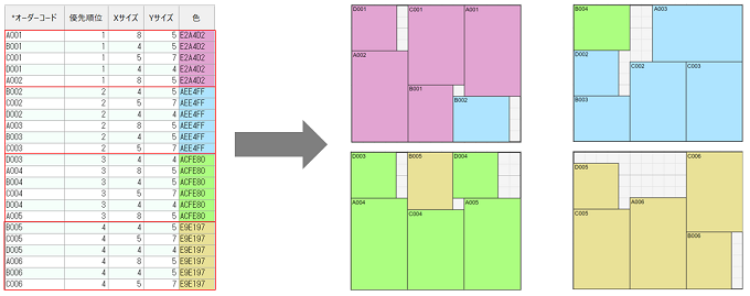 長方形の母材から特定の大きさの長方形の製品群を切り出すことを考えます。このとき、なるべく端材が出ないよう切り出したいです。また、オーダーの納期などによって製品に優先度をつけたり、製品Aと製品Bは同時に切り出したいなど様々な条件が実際には必要になります。