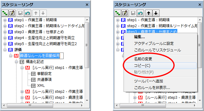 スケジューリングパネル上からルール名/メソッド概要説明の編集、ルール/メソッドのコピー&ペーストが行えるようになりました。また構造化記述内のメソッドも表示されるので、途中のダイアログを省いてメソッド編集ダイアログを直接開けるようになりました。