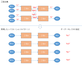[例2]のように選択される側にANDで複数のセレクタを指定できるようになったことによって、どの工程を通るかを4つのセレクタ(A,B,C,D)から選んで指定できるようになります。