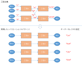 [例1]では、前工程は工程A,Bのどちらかで、後工程は工程C,Dのどちらかで作業できるという、4通りのパターンがあります。さらに、後工程で工程Cか工程Dのどちらで作業するかに応じて、前工程に投入する原料が変わります。