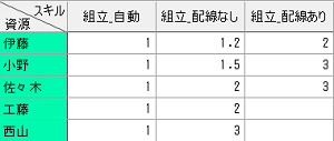 作業者ごとに能力が異なり、同じ品目を製造する場合でも時間が変わったり、そもそも人によっては作業ができなかったりするモデルを実現するために、FLEXSCHEでは作業者ごとに「スキル」を指定することができます。従来は、同じ品目でも仕様が変わるなど、場合によって適用したいスキルが変わるときには複雑な計算式を記述する必要がありましたが、新バージョンでは、計算式なしで、簡単にこのようなモデルを表現することができるようになりました。