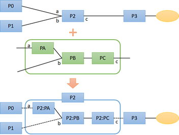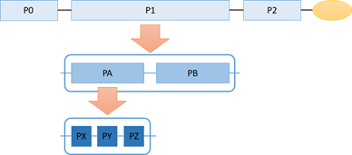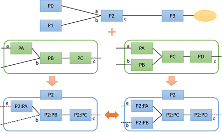 右の図では、工程P2に対して、PA→PB→PCという3工程からなる選択肢と、PA・PB→PC→PDという4工程からなる選択肢があります。自動スケジューリングによって、それらの選択肢のうちで最も望ましいとされたものが自動的に採用されます。