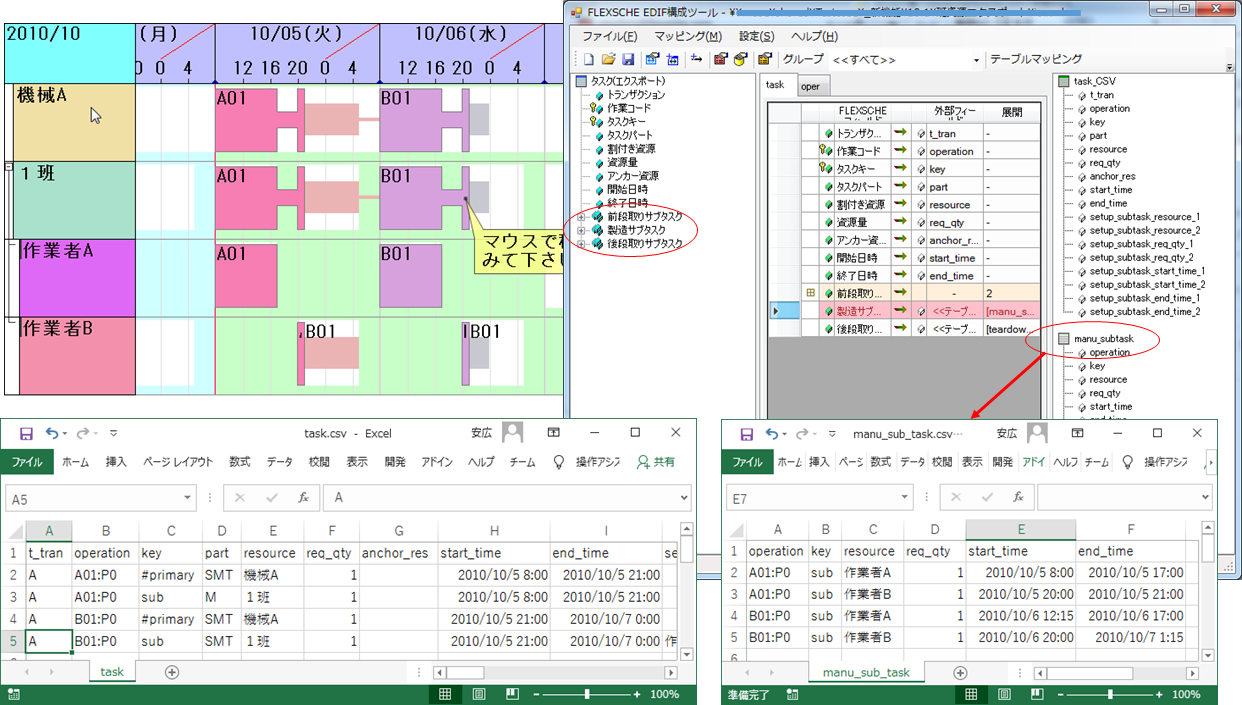 班資源へ割り付けられたタスクのその詳細であるサブタスク(班メンバーへの割当て状態)をエクスポートできるようになりました。 フィールド分離、テーブル分離に対応しており、テーブル分離の場合は計算式も利用できます。