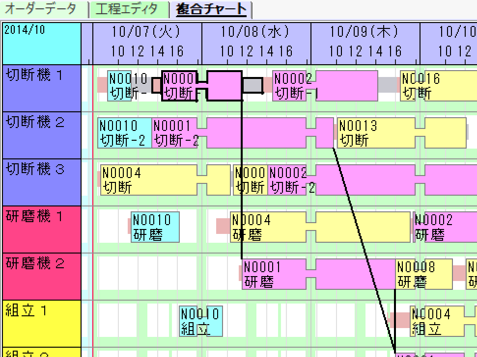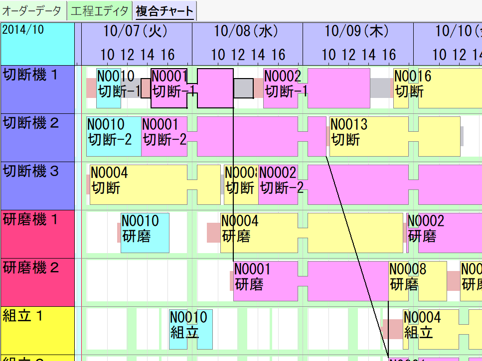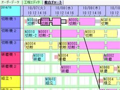 たとえば大規模な組立作業等で、複数の作業者が自由なタイミングで交代しながら作業する場合に、各作業者が実績としてどの時間帯に担当したかを資源ガントチャート上に緻密に再現することができます。