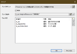 スケジューリング処理の様々な箇所に「ブレイクポイント」が設けられており、それを有効にするとブレイクすることができます。 ブレイクポイントに計算式として「ブレイク条件」を与えることによって、特定の条件を満たすときだけブレイクすることもできます。 ブレイク時の内部状態を表示するための計算式もブレイクポイントごとに自由に定義することができます。