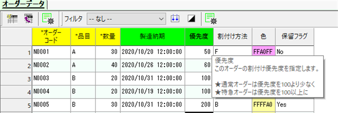 入力項目をヘッダ色で色分けしてグルーピングしたり、既定の説明に注意事項を追加するなどマスタメンテナンスがしやすくなります。