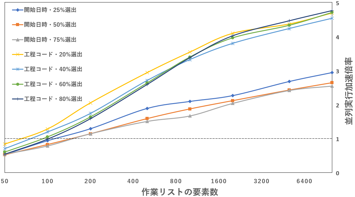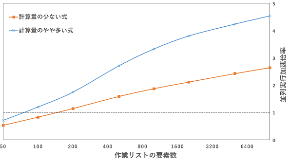 リストの要素数が多いもしくは式の計算量が多いほど並列処理による加速が顕著になり、場合によっては5倍以上に加速します。