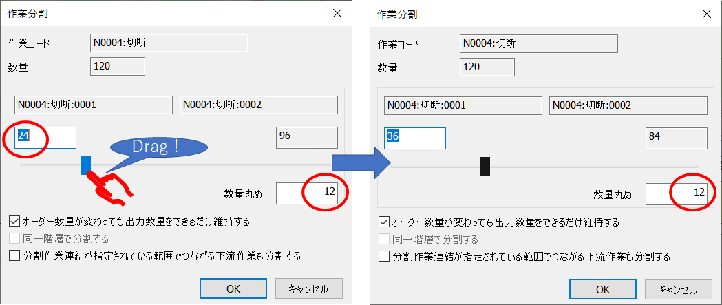 スライダバーで分割数量を決めるとき、従来は数量1ずつの移動量でしたが、丸め欄に指定した任意の数量の整数倍の移動量で数量を調整することができます。