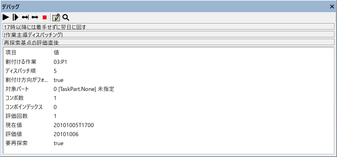 作業主導ディスパッチングメソッドのブレイクポイントに「再探索基点の評価直後」を追加しました。 現在値や評価値、何度目の再探索か等を確認することができます。