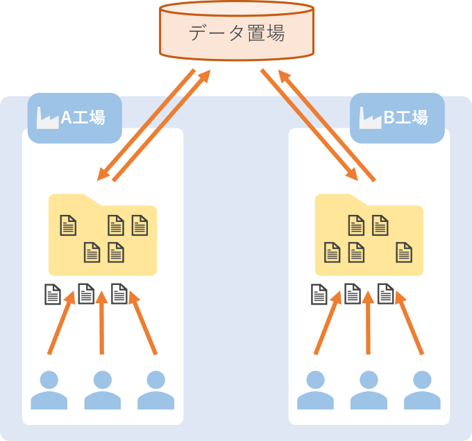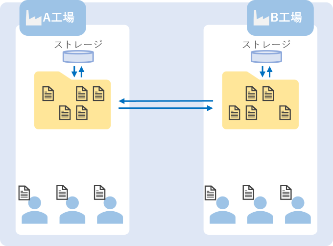 製造拠点が複数あり、それぞれにFLEXSCHE Communicatorのプロジェクトデータが存在するとします。各拠点では製造工程を分担しているため、製造計画を連携する必要があります。従来からFLEXSCHE EDIFを使用して連携が可能でしたが、いくつかの課題がありました。 例えば、EDIFインポートを行う際には、プロジェクトデータのすべてがチェックインされている必要がありました。そのため、全員の編集が完了していると想定される夜間などにバッチ処理でインポートを実行する必要があり、リアルタイム性が損なわれる要因となっていました。 さらに、データの入出力先をFLEXSCHE Communicatorの外部に配置する必要があったため、別途置き場を作成して管理する必要がありました。