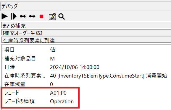 主にプロジェクトの導入・開発時において、 「なぜこの補充オーダーが生成されたのか?」を調べたくなることもあると思います。 そのときに役立つ機能として、補充オーダー生成メソッドのブレイクポイント「在庫時系列要素に到達」で 定義済み変数 $_record を利用できるようにしました。 これによって、在庫量が増減するきっかけとなった対象が見えるため、調査しやすくなります。