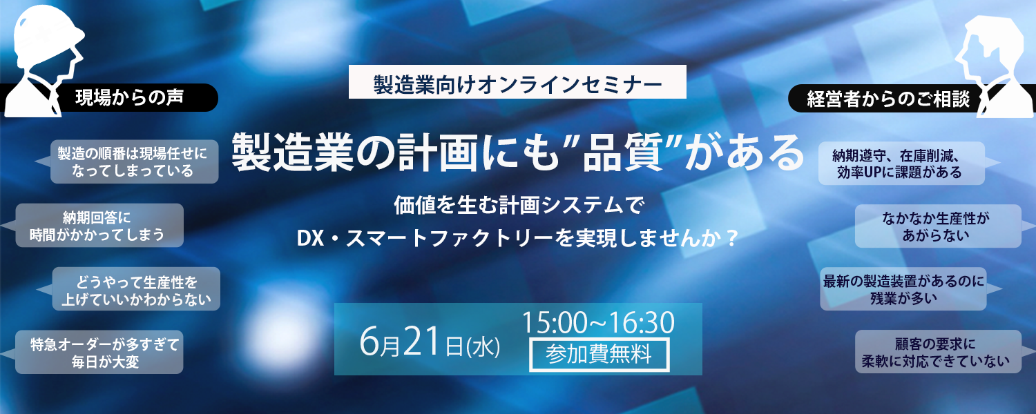 | セミナー名 | 製造業の計画にも”品質”がある! 価値を生む計画システムで DX・スマートファクトリーを実現しませんか? |