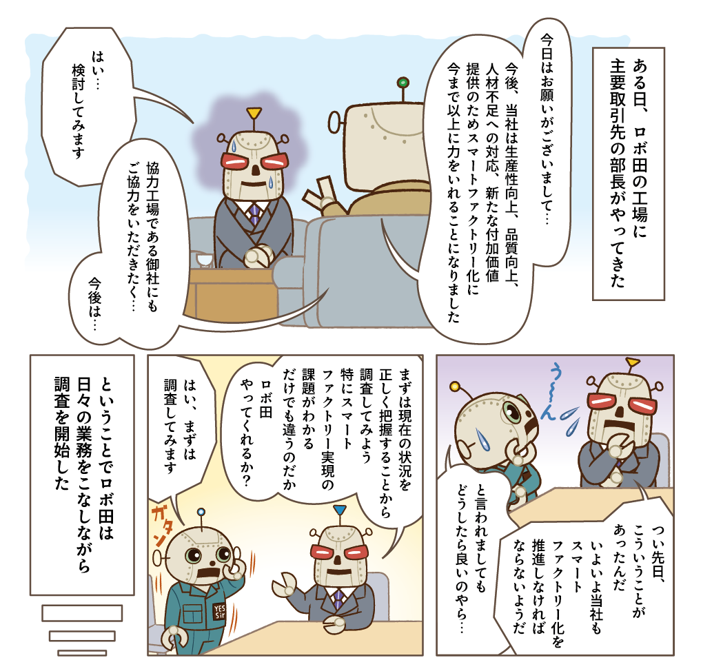「こんなことが現場で起こっているんです。なんとかできないですか?」ロボ田は、調査を進める中で見えてきた工場内の状況や課題をフレクシェロボに打ち明けました。
