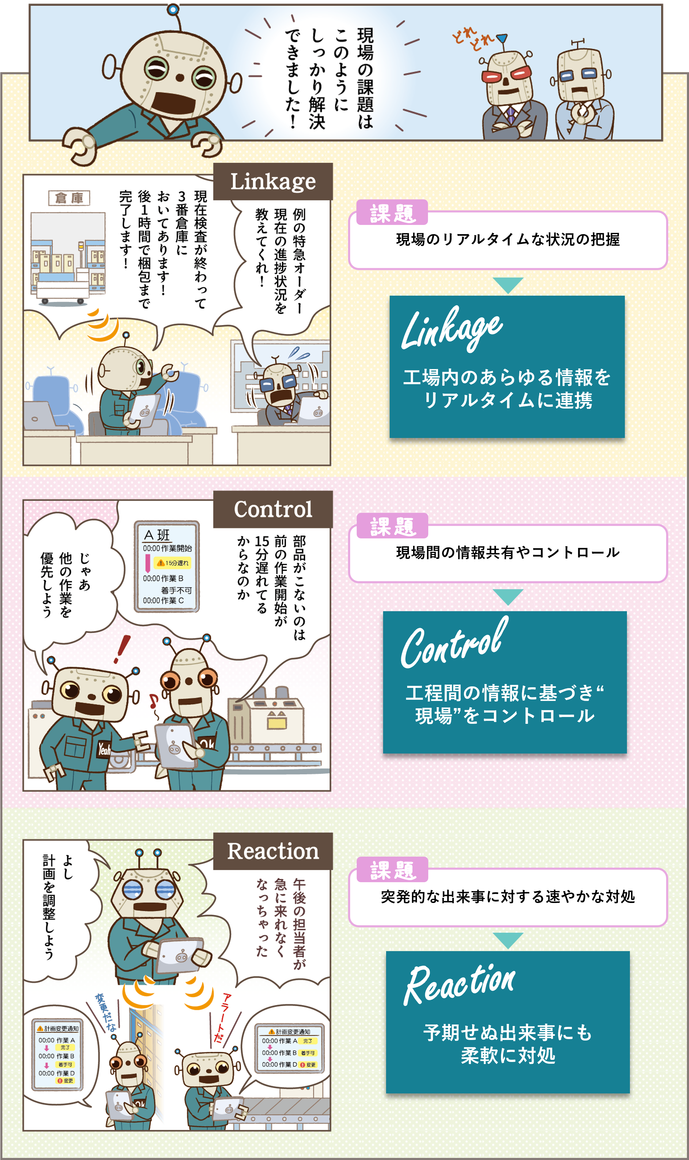 「大丈夫です。」フレクシェロボは力強く言いました。「FLEXSCHE CarryOutを使えば、これらの課題も解決できます。一緒にスマートファクトリーへの第一歩を踏み出しましょう。」FLEXSCHE CarryOutなら、計画に基づいたものづくりの“遂行”までサポートしてくれるというのです。その言葉を聞いて、ロボ田はなんだかFLEXSCHE CarryOutを使えば、工場内の課題が解決できるかもしれないという気がしてきました。