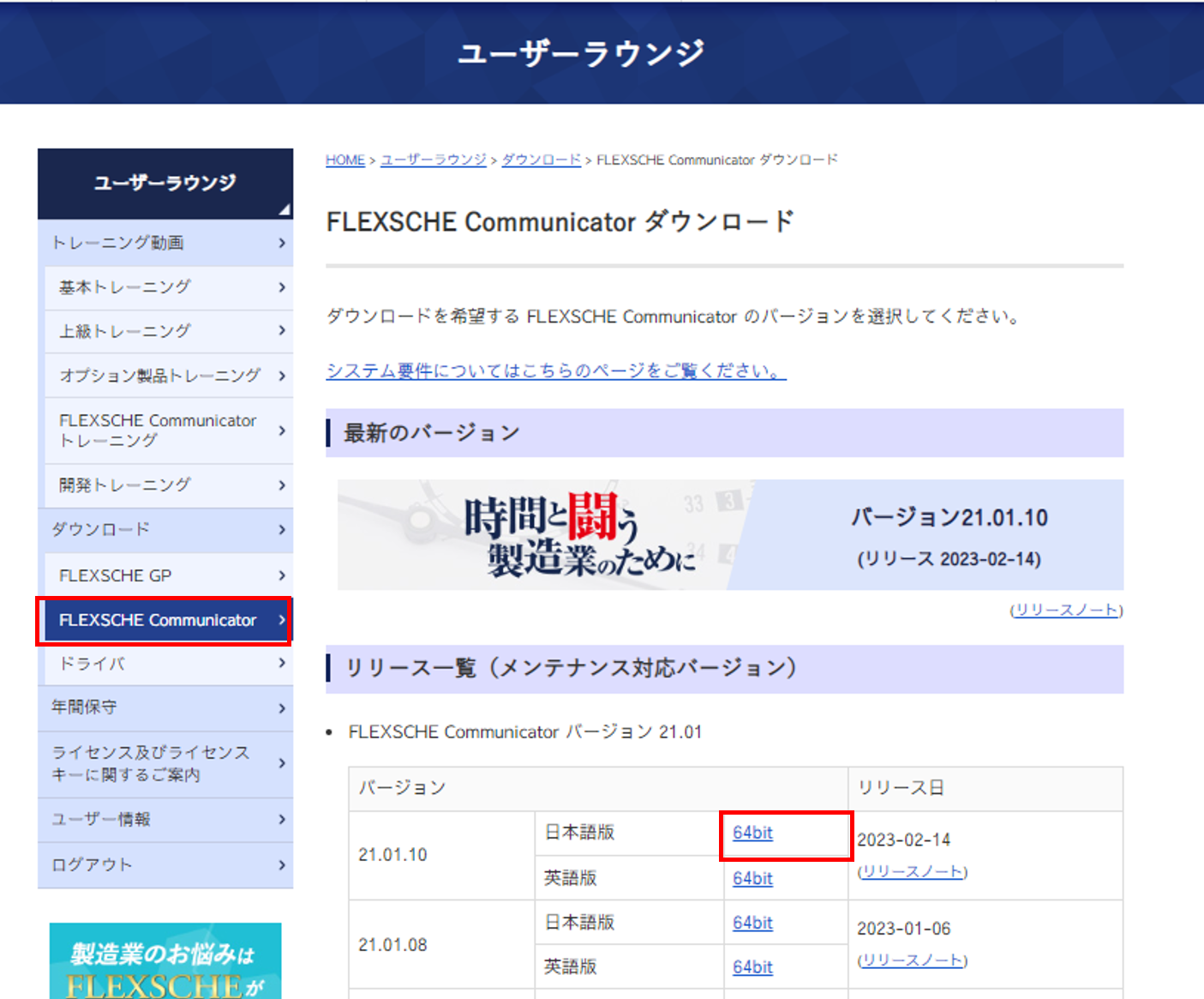 ユーザーラウンジにログインし、サイドメニューの[ダウンロード]下にある [FLEXSCHE Communicator] をクリックしてください。