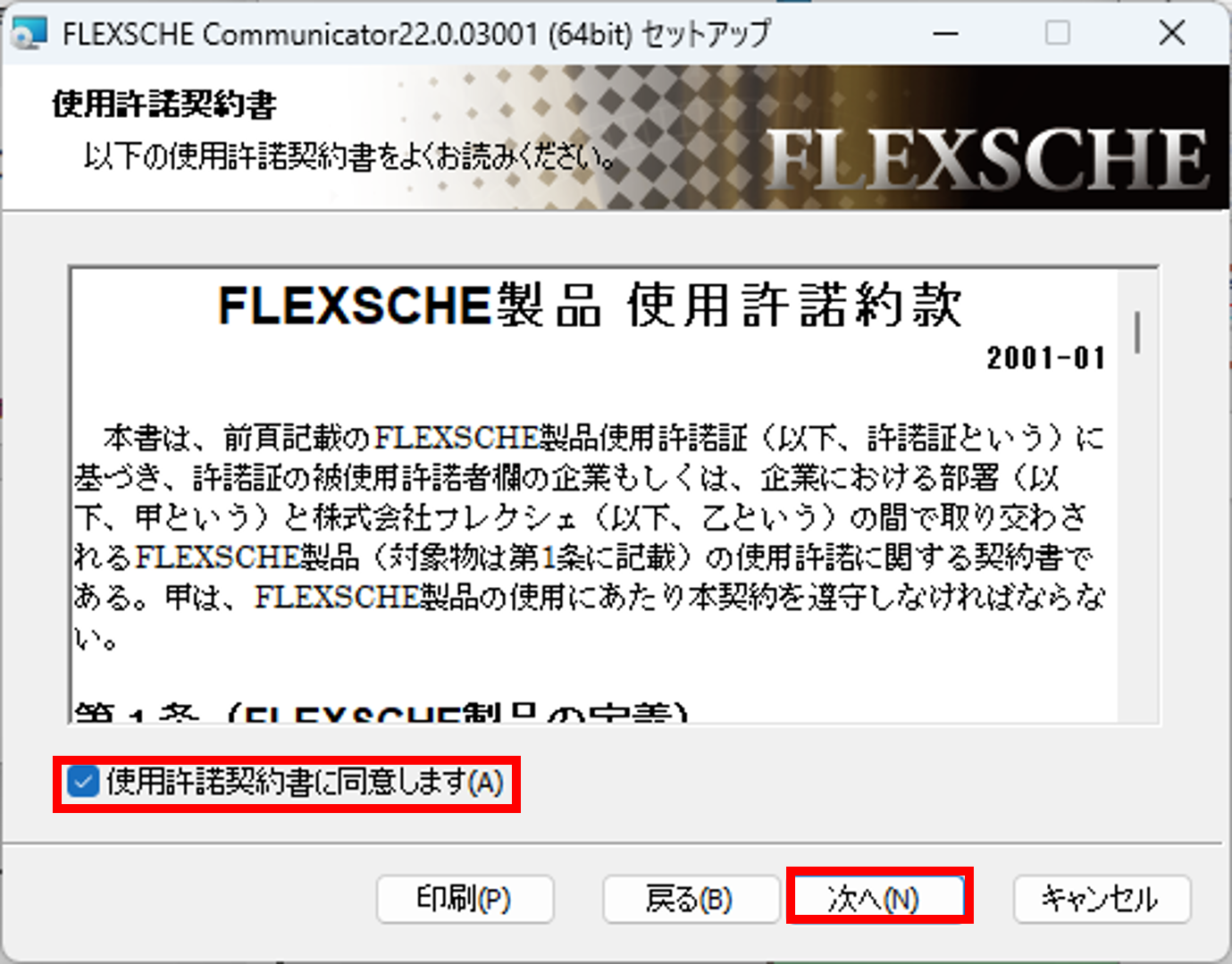 使用許諾約款を確認後[使用許諾契約書に同意します]にチェックを入れて[次へ]を選択してください