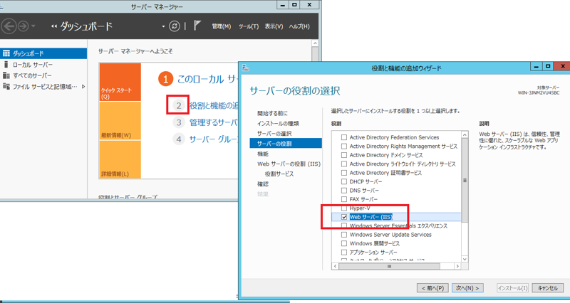 サーバーマネージャを開き、ダッシュボードから [役割と機能の追加]を選択してください。 設定項目の中にある[サーバーの役割]から、[Webサーバー(IIS)]を選択してください。 「役割と機能の追加ウィザード」ダイアログが表示されますのでそのまま「機能の追加」を選択してください。