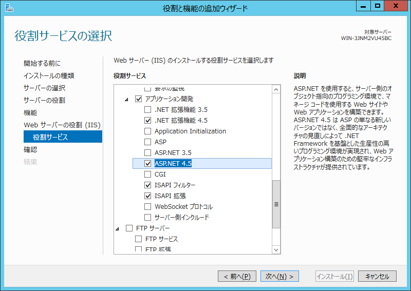 「役割サービス」の項を開き、[Webサーバー]、[アプリケーション開発]、[ASP.NET 4.5]を選択してください。 「役割と機能の追加ウィザード」ダイアログが表示されますのでそのまま「機能の追加」を選択してください。