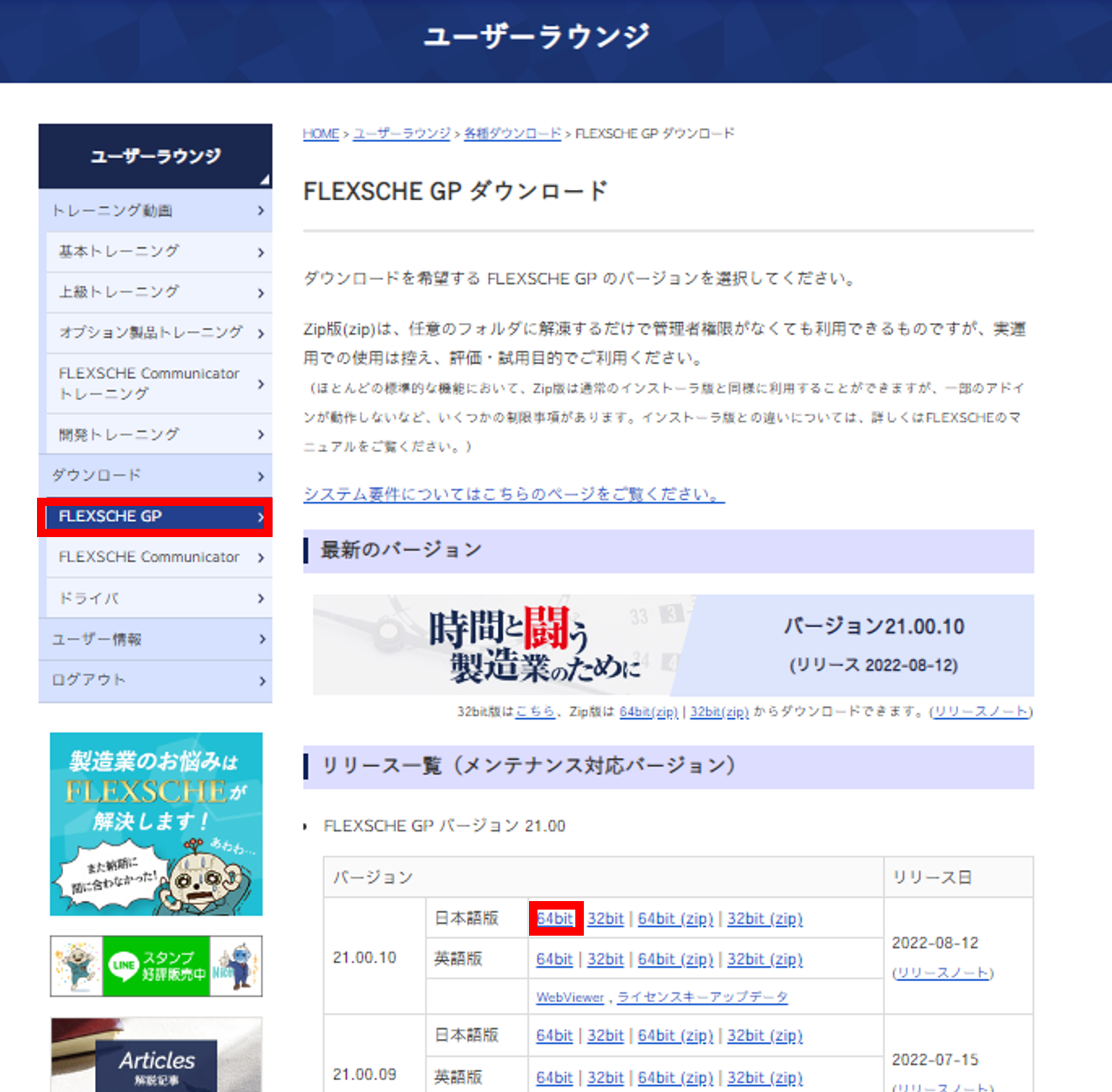 ユーザーラウンジにログインし、サイドメニューの[ダウンロード]下にある [FLEXSCHE GP] をクリックしてください。
