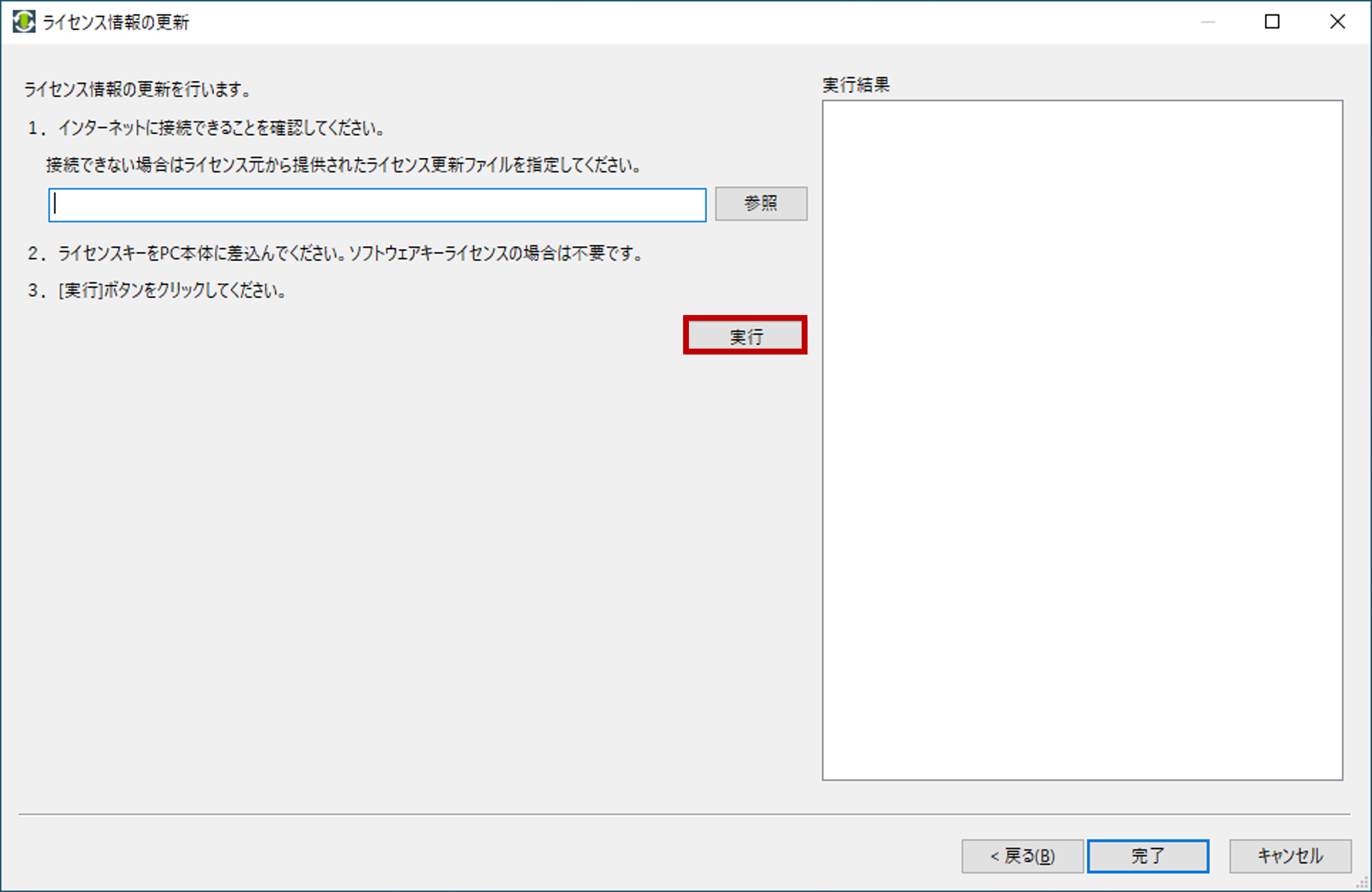 6.[参照]からライセンス更新ファイルを選択し、[実行] ボタンをクリックしてください。