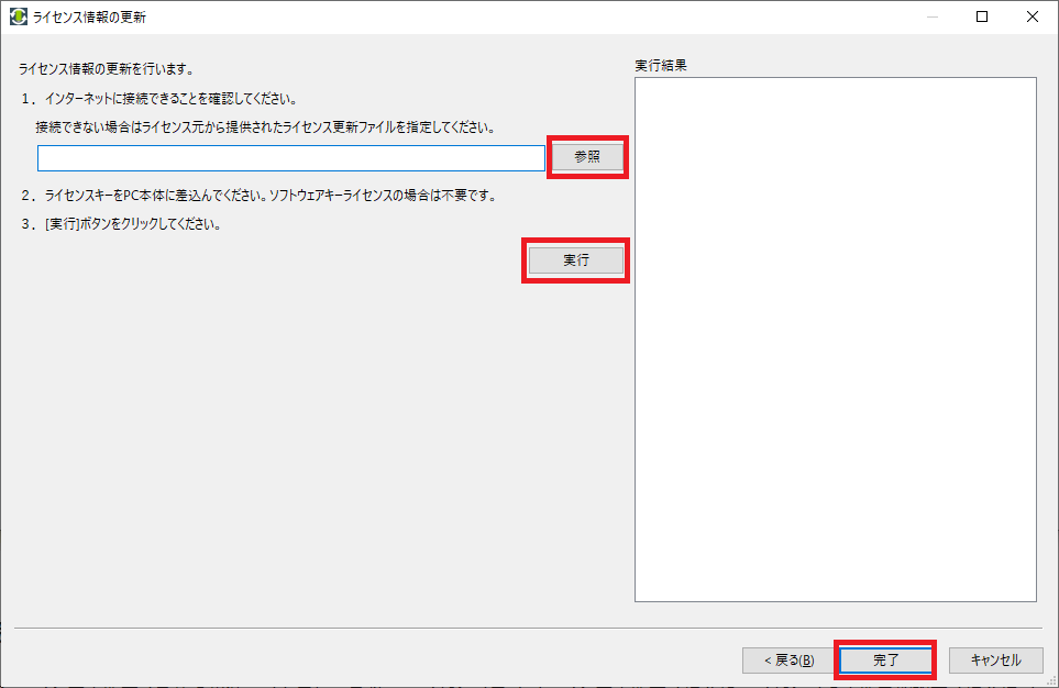 [参照]からライセンス更新ファイルを選択し、[実行] ボタンをクリックしてください。 [完了]ボタンをクリックし、ライセンスキーアップデーターを終了してください。