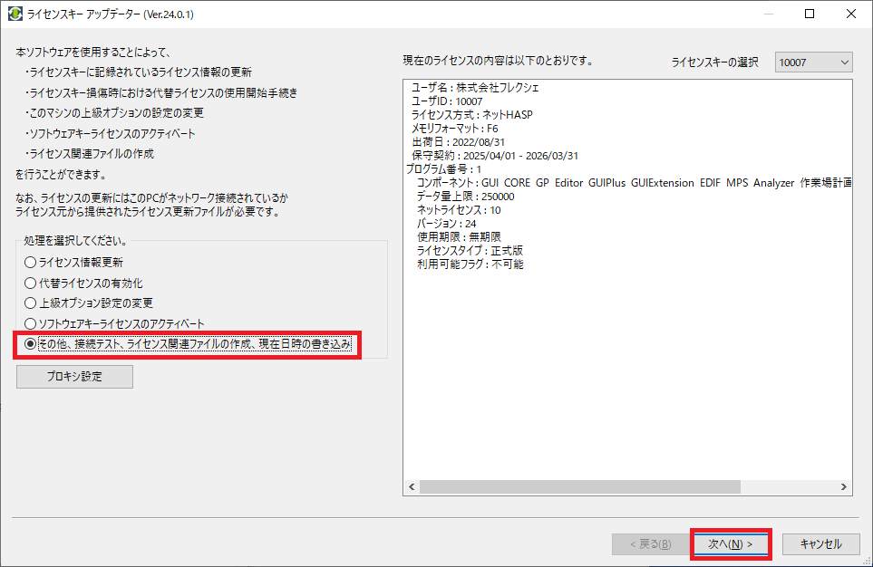 [その他、ライセンス情報の関連ファイルの作成、現在日時の書き込み]を選択し、[次へ]をクリックしてください。