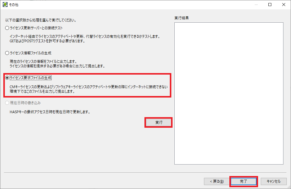 [ライセンス要求ファイルを作成]を選択し、[実行]をクリックして下さい。[完了]をクリックしてライセンスキーアップデーターダイアログを閉じます。