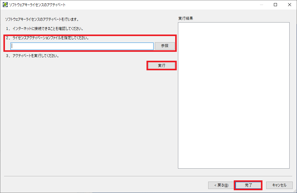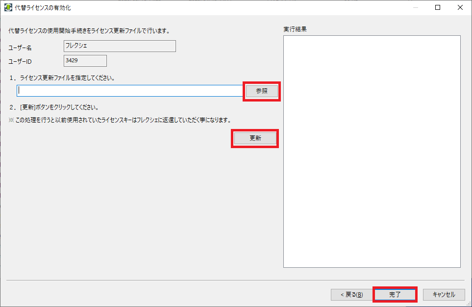 [参照]から製品納品時にフレクシェ社から送付された代替ライセンスキーの「ライセンスアクティベーションファイル」を選択し、[実行]をクリックしてください。[完了]ボタンをクリックし、ライセンスキーアップデーターを終了してください。