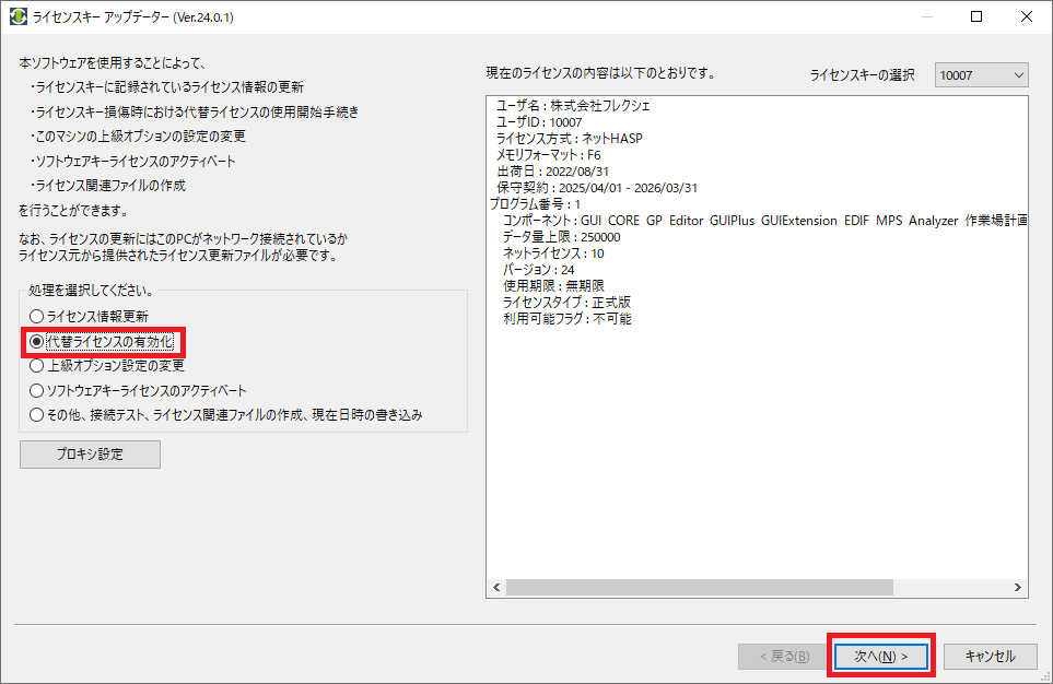 利用可能なライセンスキーが挿入されていれば、[ライセンス情報更新] が選択されているはずです。選択されていることを確認して、[次へ] をクリックしてください。
