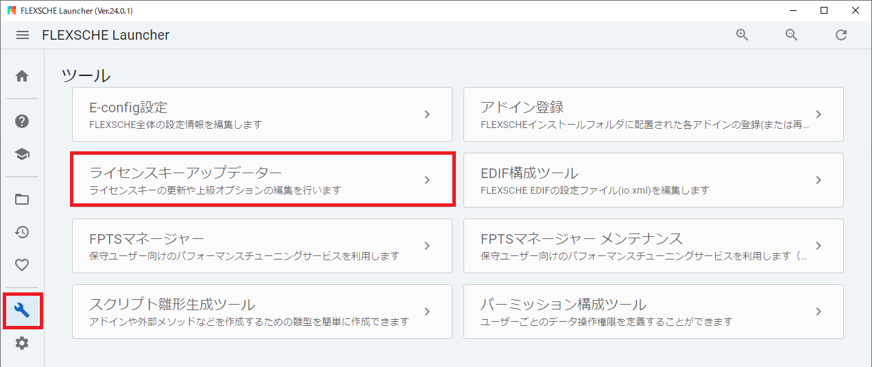 [FLEXSCHEランチャー]を起動し、[ツール]から[ライセンスキーアップデーター]を起動してください。[ライセンスキーアップデーター] ダイアログが表示されます。