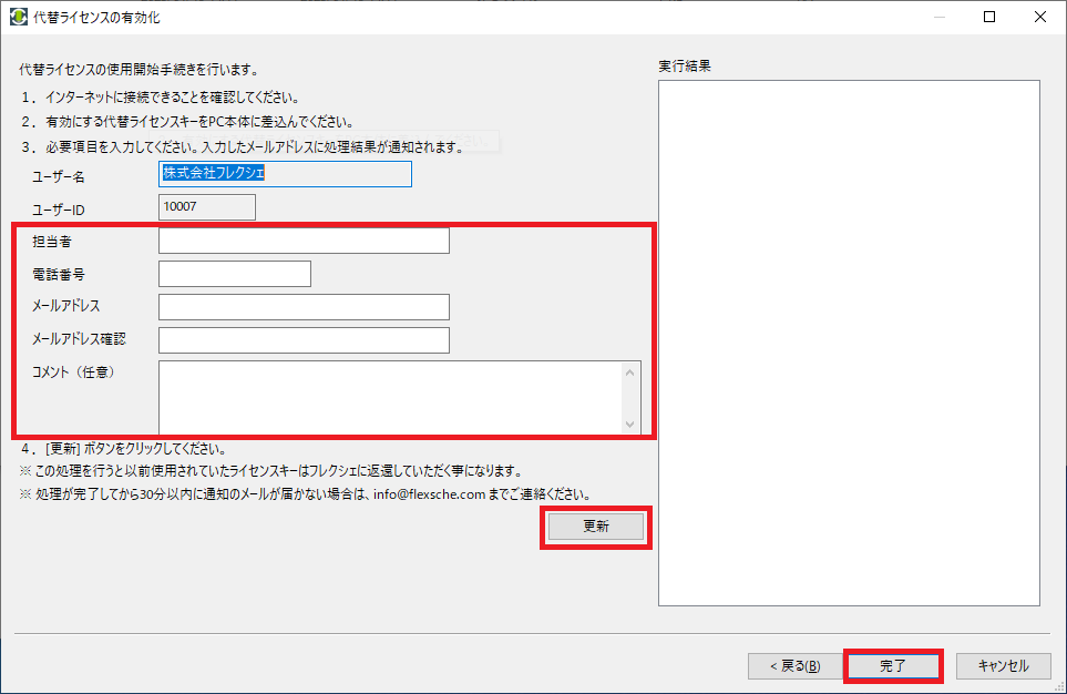 担当者の氏名・電話番号・メールアドレス・ コメント(任意)を入力し、[更新] ボタンをクリックしてください。 [完了]ボタンをクリックし、ライセンスキーアップデーターを終了してください。更新手続きの案内メールがアドレス宛に送信されます。