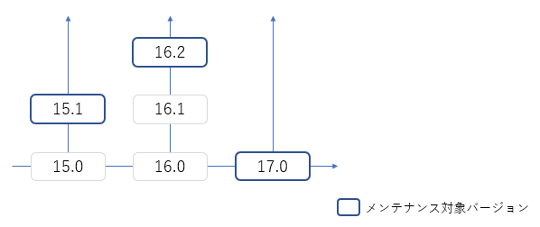 である場合、「最新バージョン」が17.0であるときには、「ひとつ前のバージョン」は16.2です。そして「前バージョンのひとつ前のメジャーバージョン」は15で、その最後のマイナーバージョンは15.1となるので、3つのメンテナンス対象バージョンは